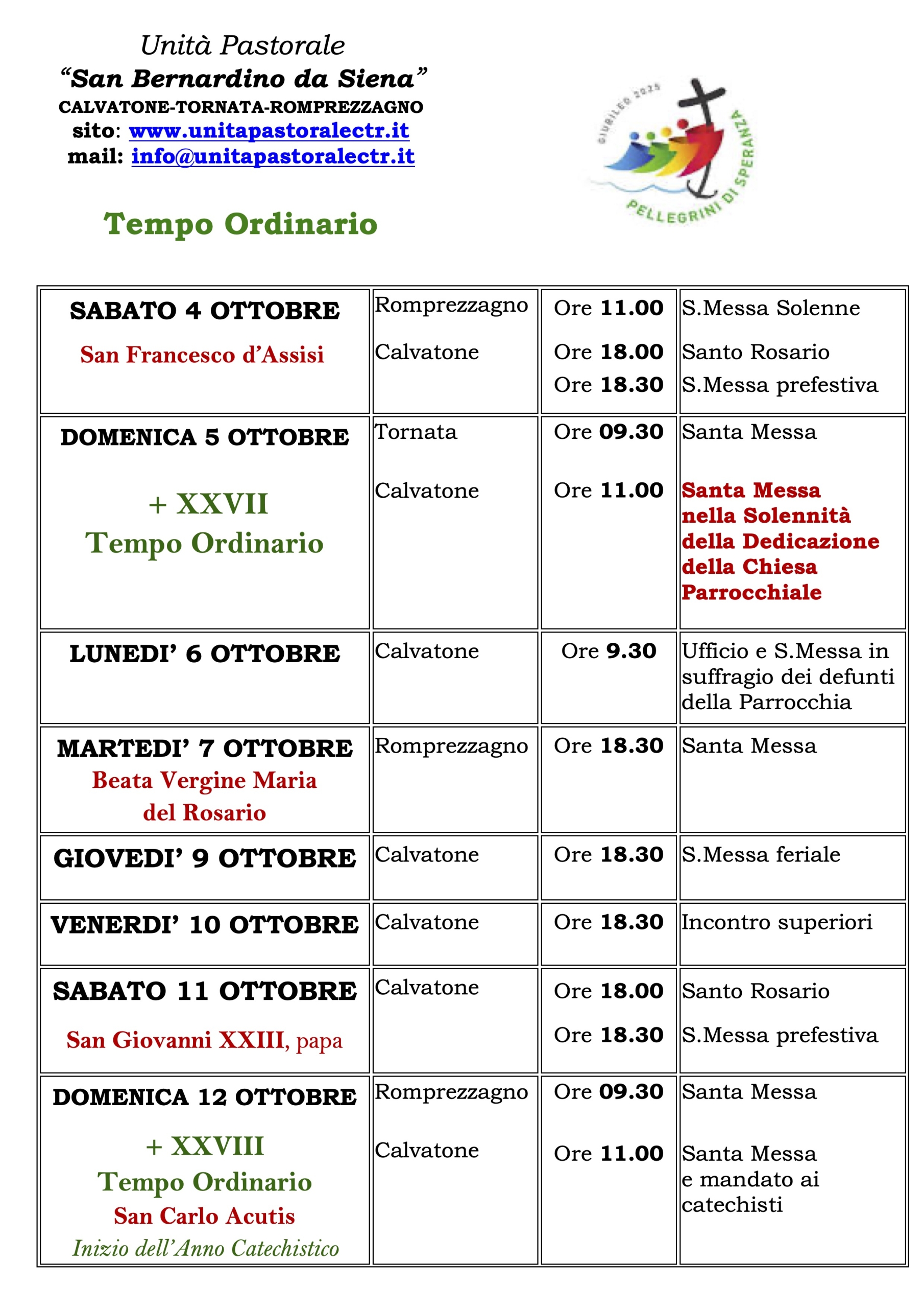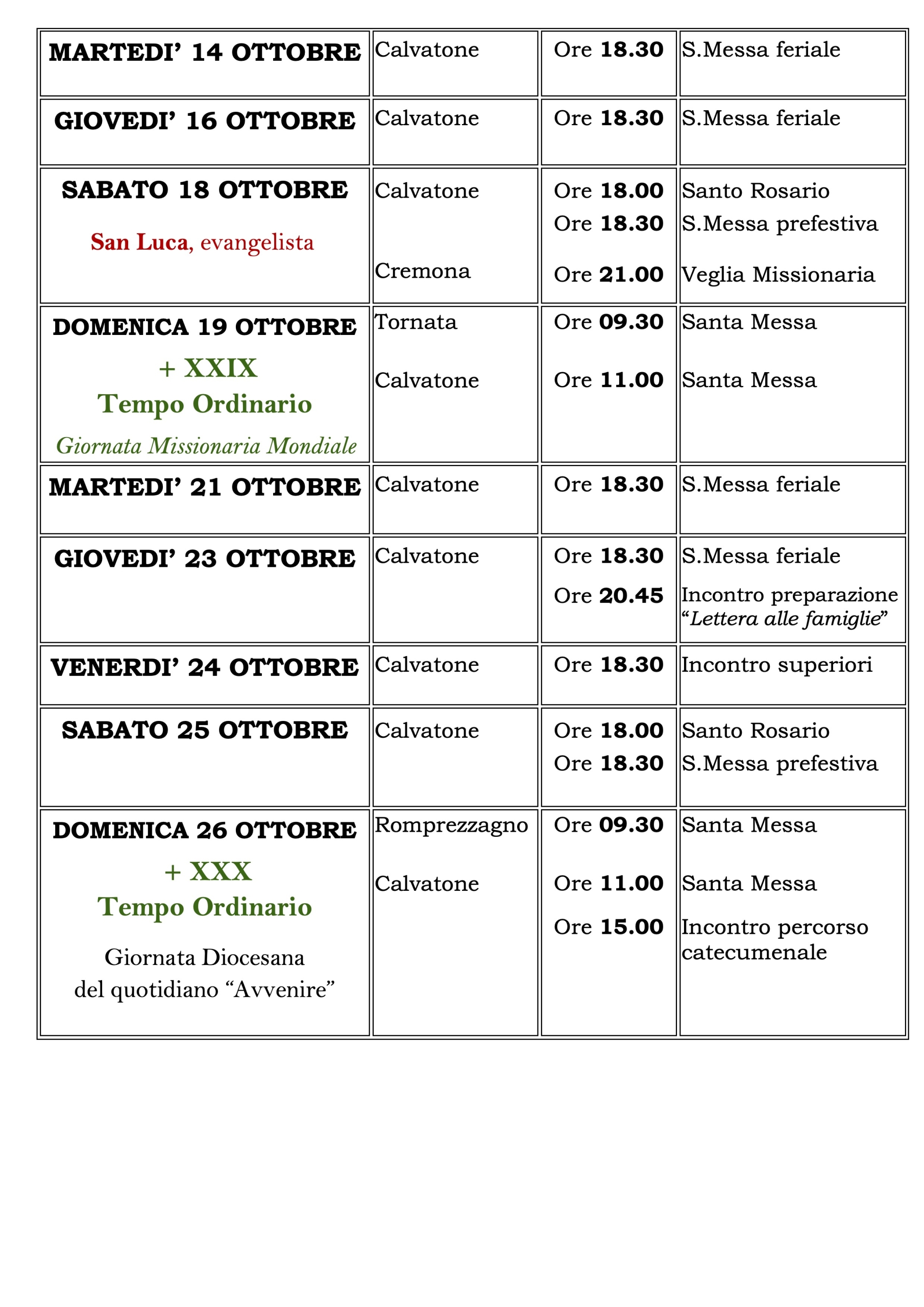 Calendario Liturgico – 5 Ottobre / 26 Ottobre
